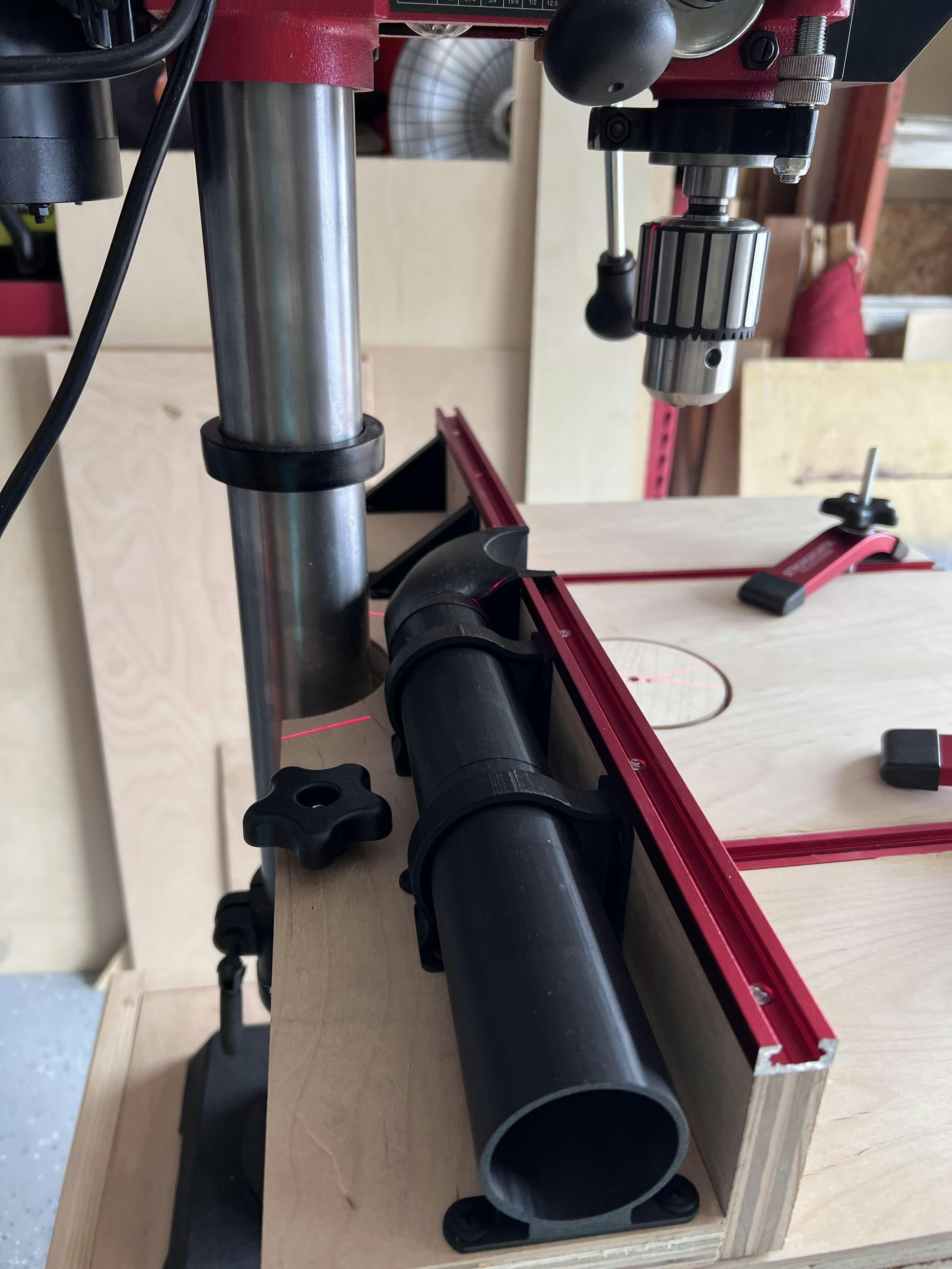 Enhance your drill press table with the fence dust collection system. You really want dust collection when you're drilling multiple holes in a row or when you're using a spade or forstner bit since these can create a ton of dust and who wants a dusty shop!