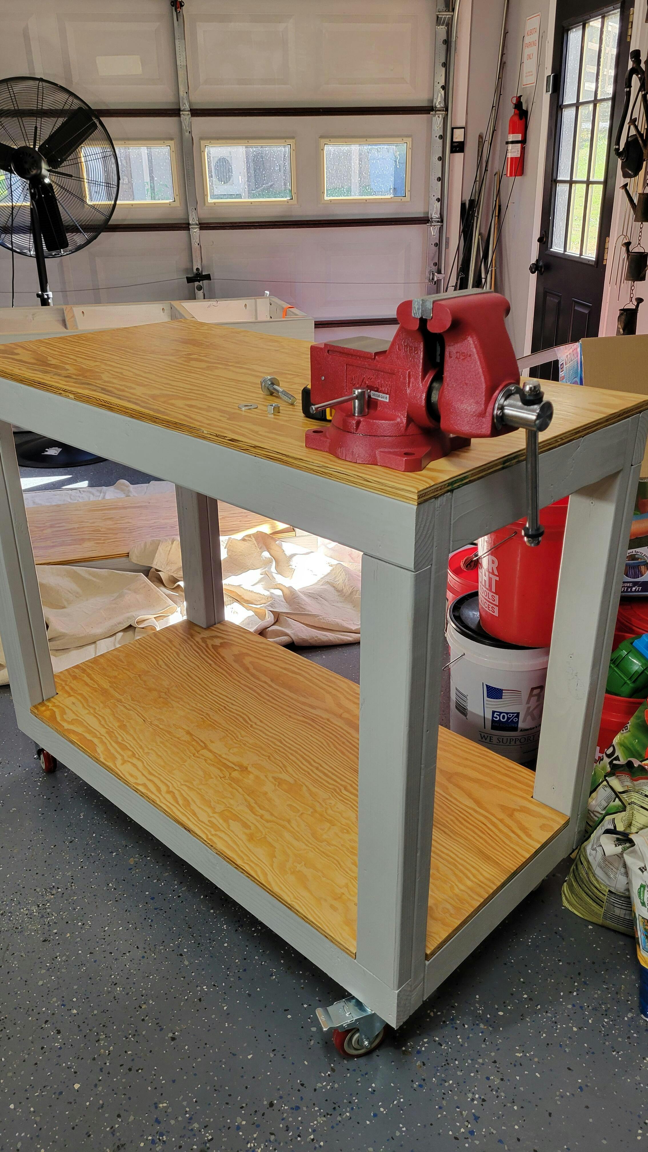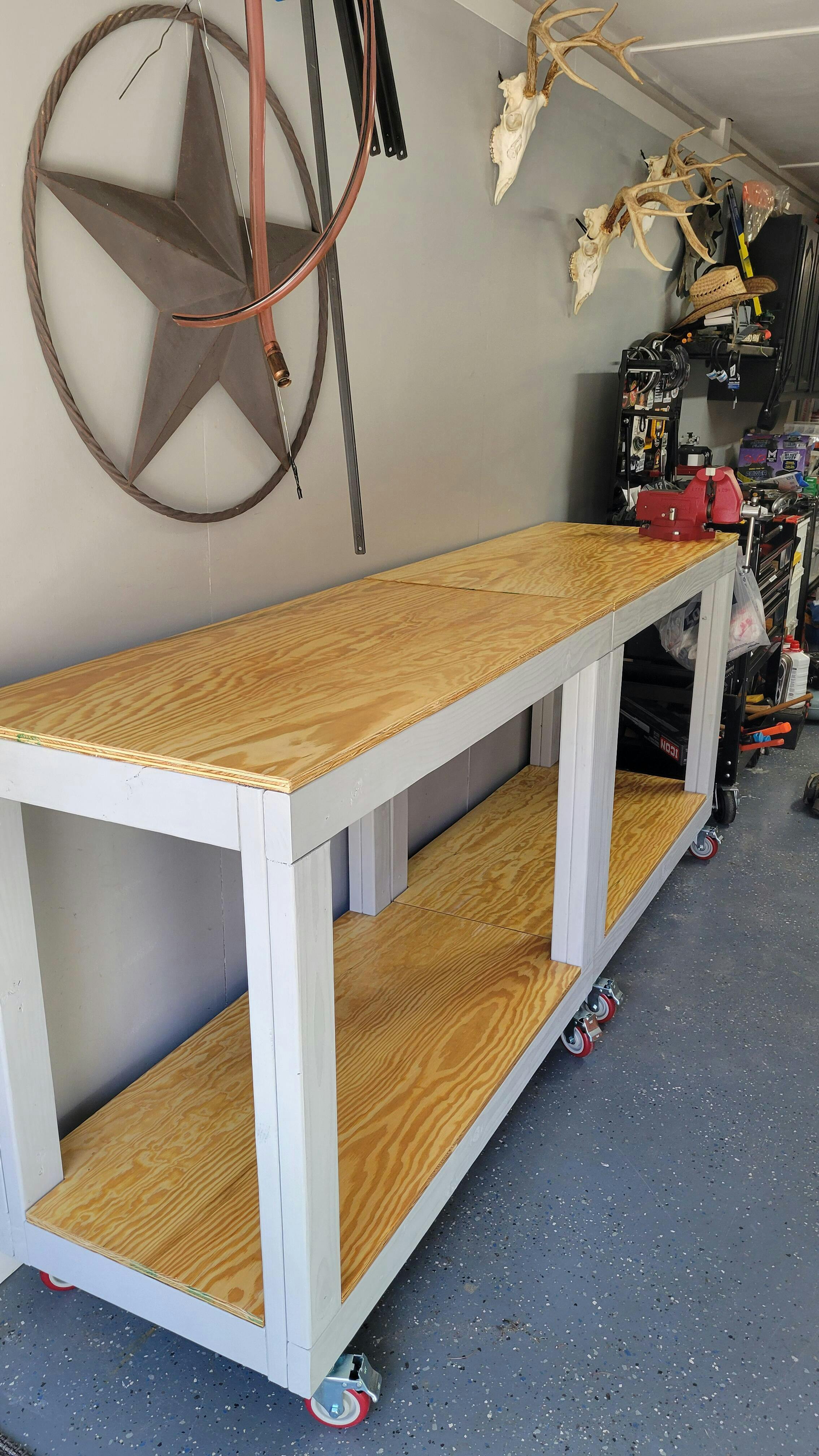 The modular work benches were easy to build and fit perfectly in my garage against the wall in the 2x8 foot orientation. When needed they can quickly be rolled to the center of the room and used in various configurations. I kept the leg dimensions similar to those in the plans and appreciate the added height as I am 6'4.