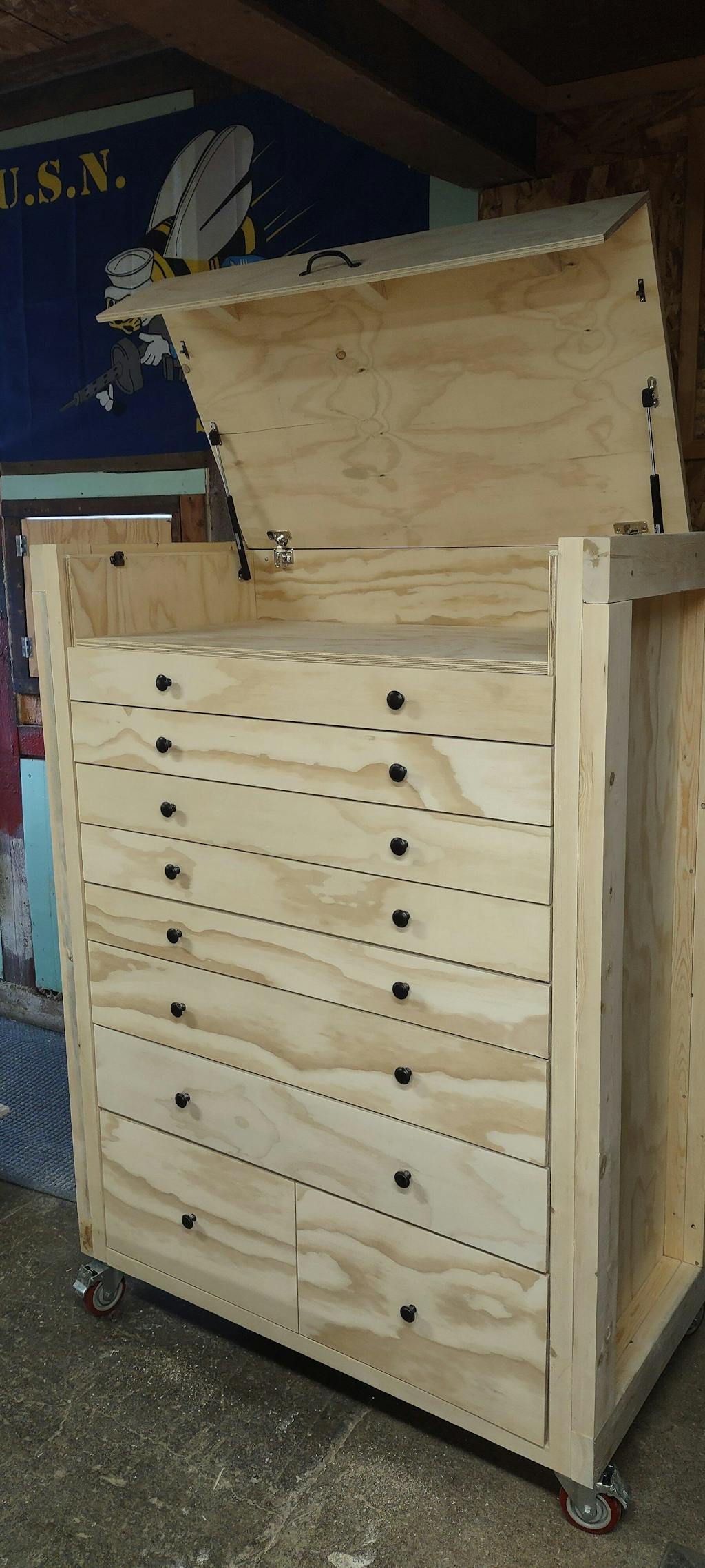 The cabinet is 45.5" x 63” x 24" built on a beefy 2×4 frame. The build includes 10 total drawers and an enclosable work platform with an integrated power strip. Totaling over 19 cubic feet in storage capacity